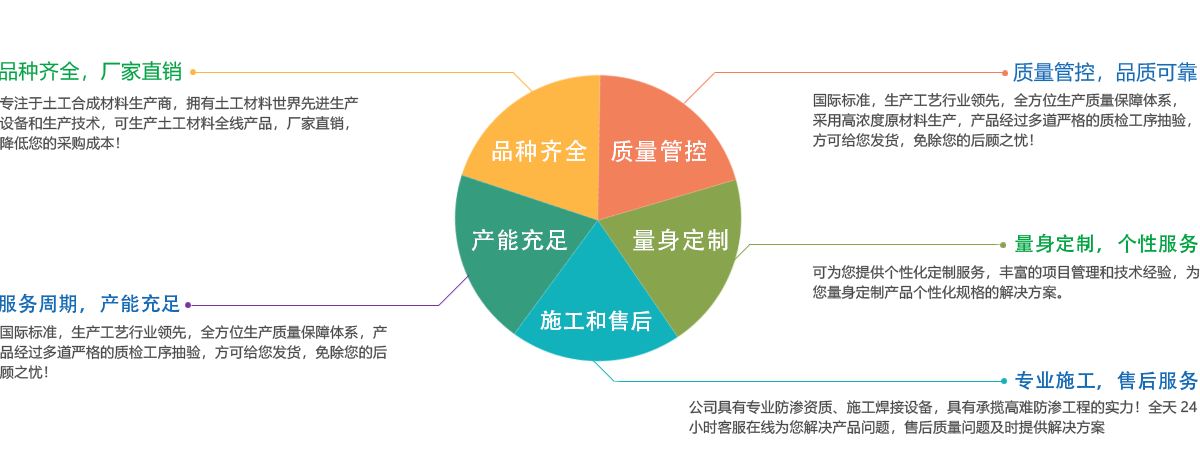 公司所有產(chǎn)品均采用國際標(biāo)準(zhǔn)組織生產(chǎn),并經(jīng)國家、市技術(shù)監(jiān)督局采標(biāo)驗收,生產(chǎn)工藝及水平全國領(lǐng)先,屬國內(nèi)優(yōu)等水平,實物質(zhì)量達(dá)到國際先進(jìn)水平。經(jīng)用戶、施工單位使用證明,質(zhì)量穩(wěn)定可靠、施工方便、價格合理、售后服務(wù)完善。產(chǎn)品主要應(yīng)用于農(nóng)業(yè)、海綿城市建設(shè)、公路、鐵路、垃圾填埋場防滲,水利、電力、水土保持及環(huán)境綠化與基礎(chǔ)建設(shè)領(lǐng)域,已被廣泛應(yīng)用于高速公路、鐵路、垃圾填埋場等多項國家重點工程,受到工程界專家及廣大用戶的一致好評。